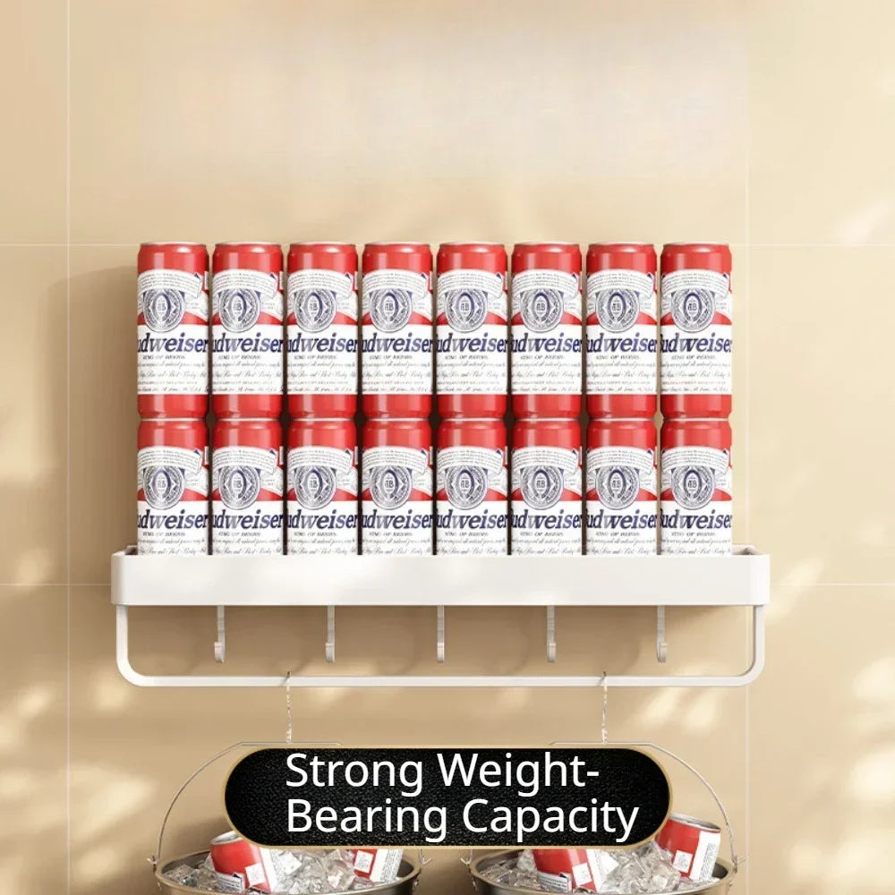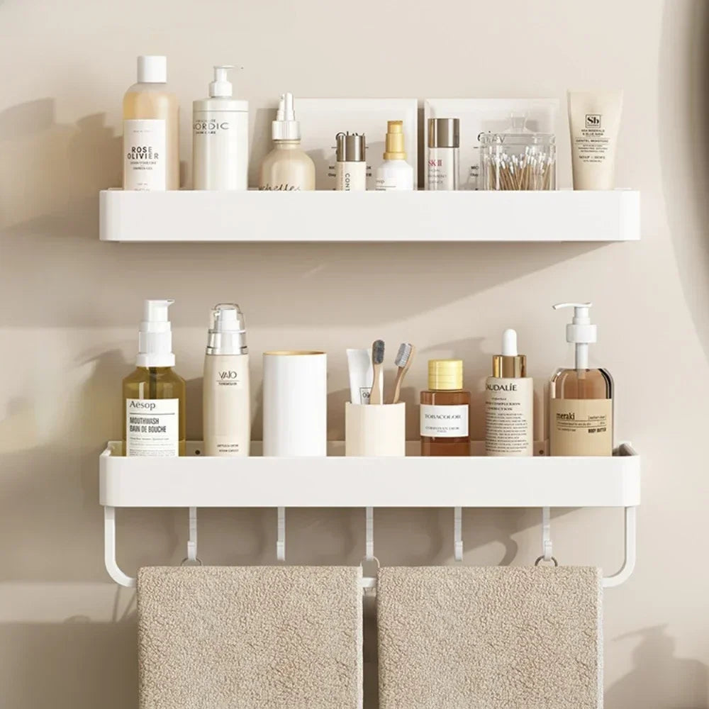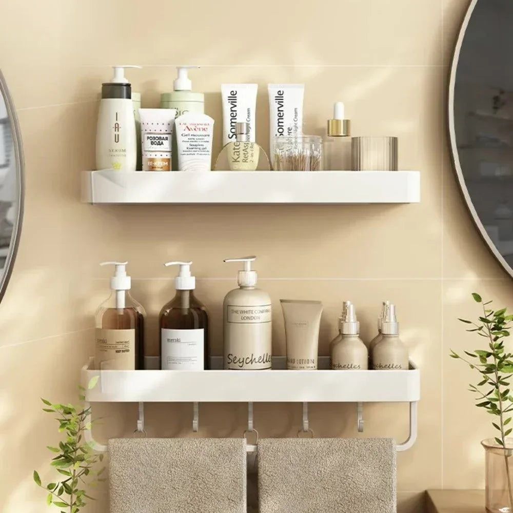 This wall-mounted storage rack features a sleek, cream-colored design with multiple compartments, sturdy hooks, and a convenient rod, perfect for holding shower gel, shampoo, razors, and towels. Built from durable, water-resistant materials, it keeps everything neatly in place, whether in the bathroom, kitchen, or laundry area. Its easy installation and elegant look transform ordinary walls into stylish, functional storage solutions.